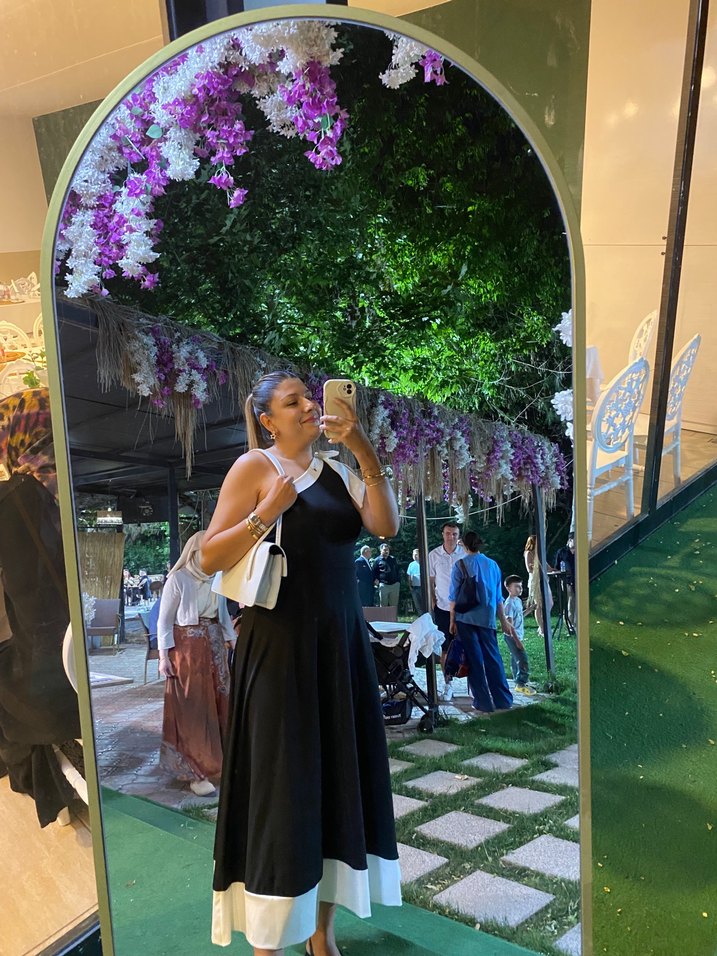 Pamuk kumaştan, askısız ve salaş kesim siyah midi elbise. Drapeli ve bağlama desenlidir, düğün için uygundur.