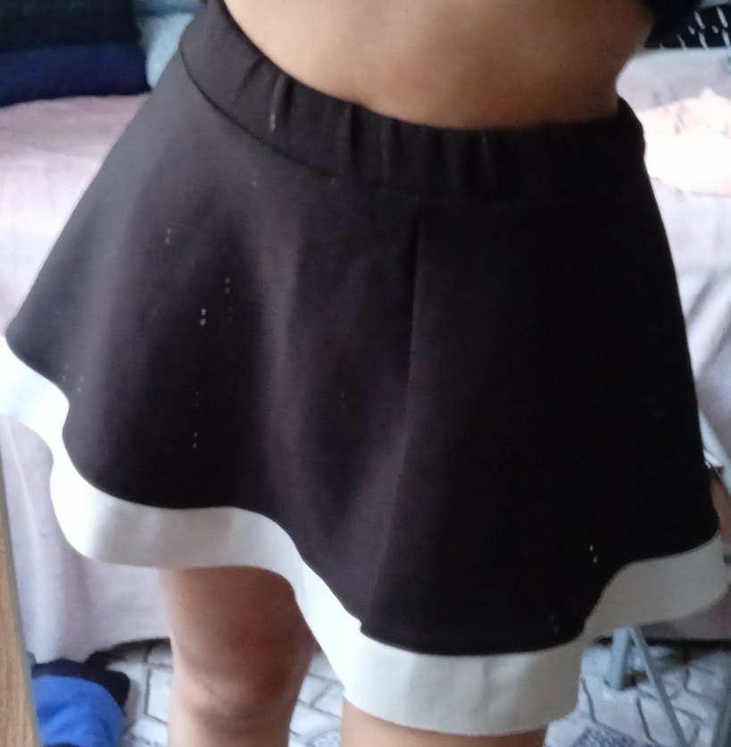 Parlak siyah sentetik kumaştan, beyaz kenarlı ve hafif fırfırlı, sokak stili uyumlu dar mini etek. ✨