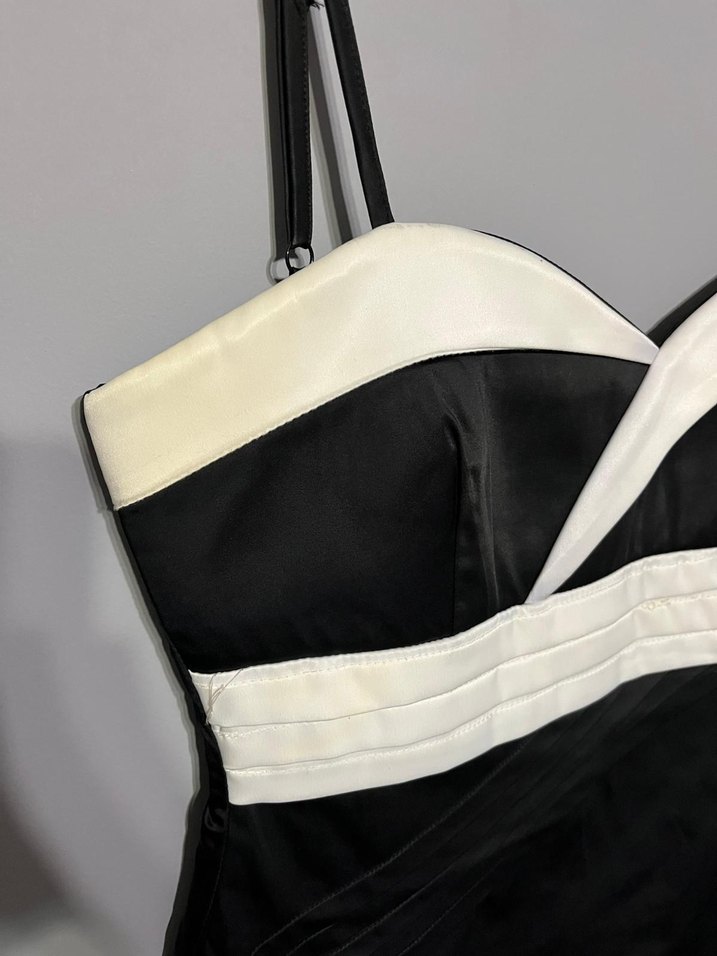 Straplez yaka, ince askılı, pilili detaylara sahip siyah beyaz mini gece elbisesi. Fitted kesimi ve baskılı deseniyle modern ve avangart tarzlar için uygun. Parti için ideal.