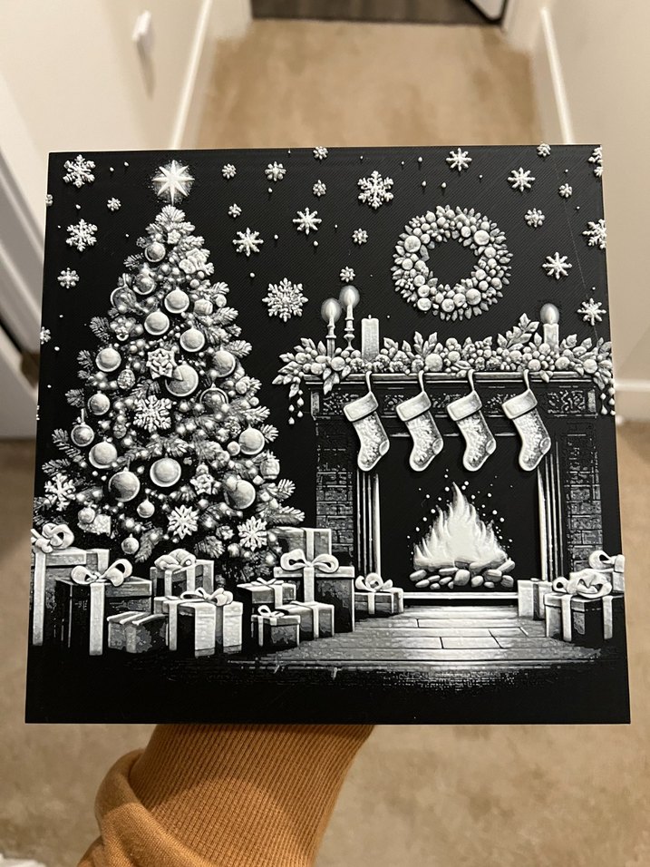 Noel temalı siyah beyaz duvar dekoru, çam ağacı, şömine, çoraplar ve hediyelerle süslenmiştir. İsteğe göre, duvar dekorları basabilirim. 3d yaziciyla yapıyorum.