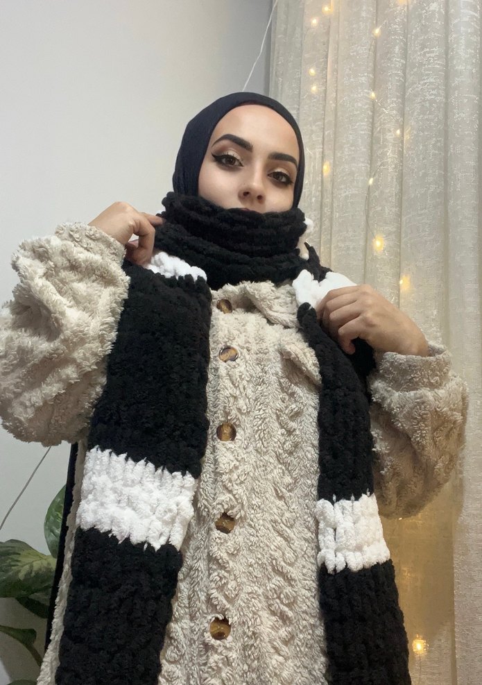 Siyah beyaz örgü atkı, sıcak tutan ve mütevazı sokak stili sunar. Yumuşak örme kumaşıyla serin günler için uygundur.