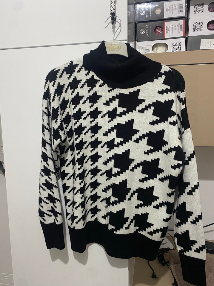 Uzun kollu, boğazlı, siyah-beyaz büyük kazayağı desenli, bol kesim örgü kazak, rahat sokak stili için uygun.