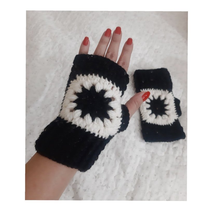 Siyah Beyaz Örgü Bohem Parmaksız Eldiven