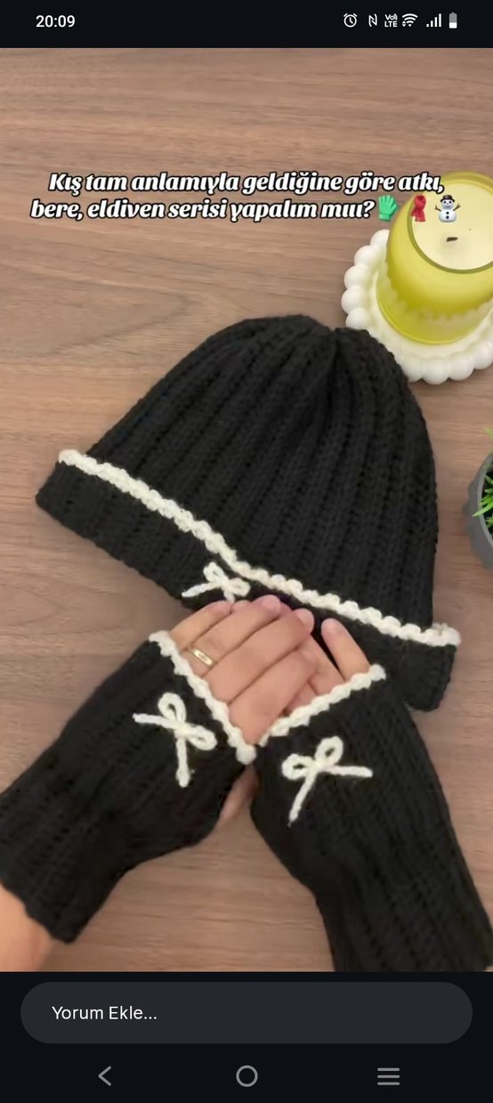 Siyah örgü bere ve parmakları açık eldiven seti, beyaz süslemeler ve fiyonk detaylarıyla karanlık, gotik tarzı tamamlar.