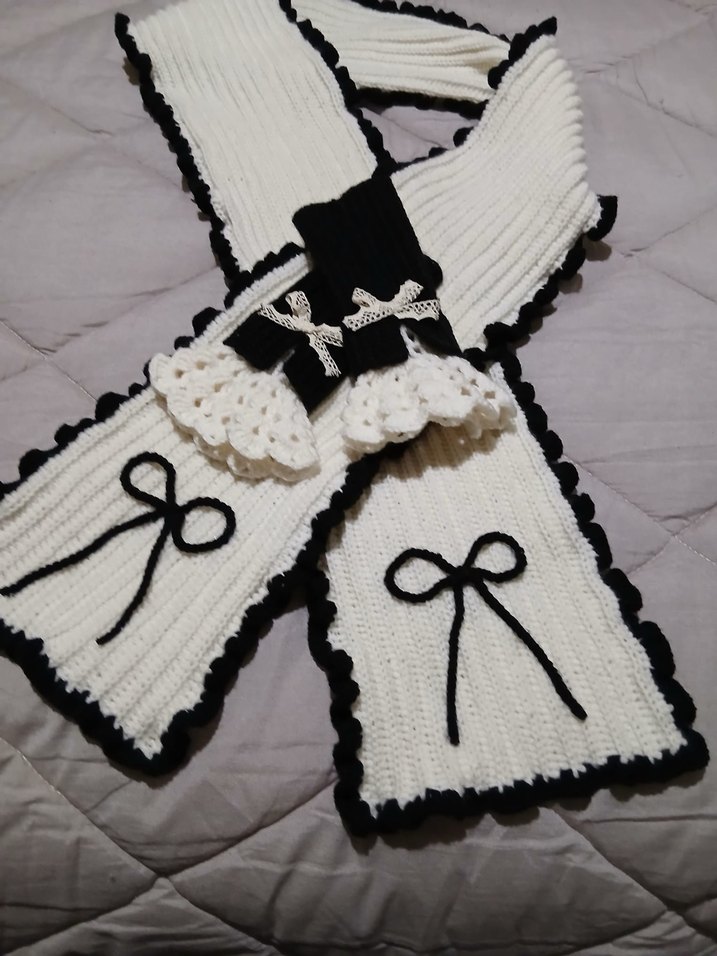 Beyaz örgü eldivenler siyah kenarlık ve zarif fiyonk detaylarıyla sıcak ve gotik bir stil sunar. Örgü dokusu şıklık katar. İstenilen renkte yapılır
