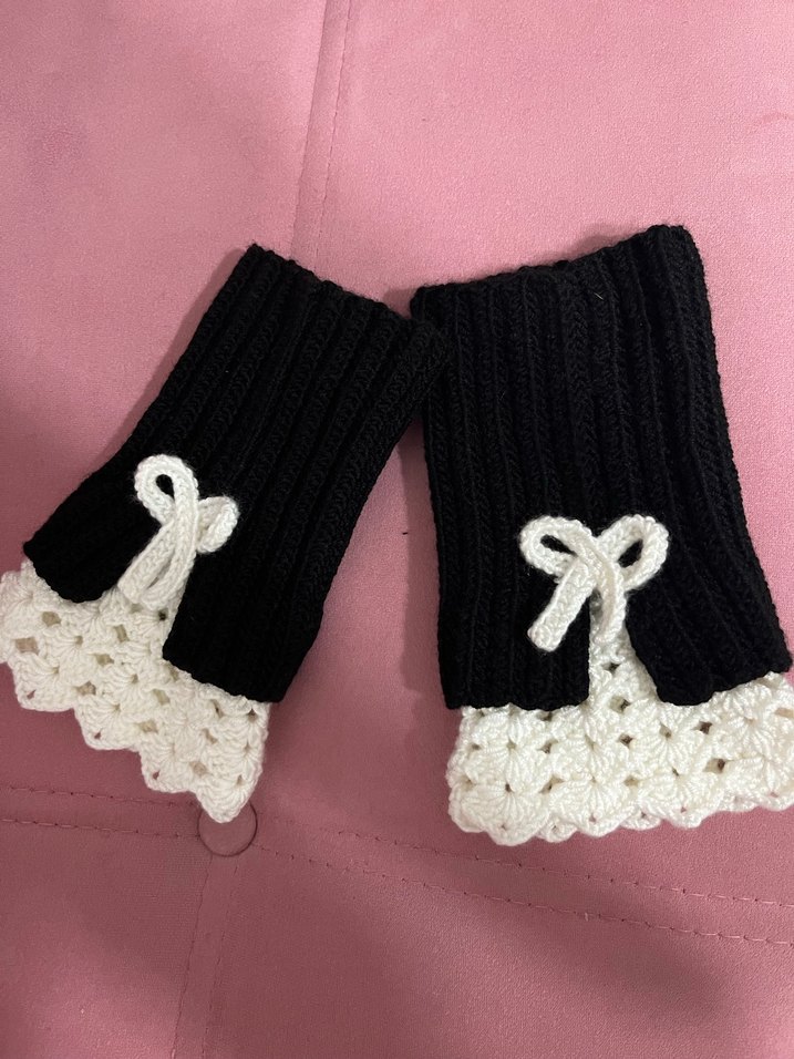 Siyah örgü kadın eldiven, beyaz tığ işi manşet ve fiyonk detaylarıyla rahat ve gotik bir tarz sunar.