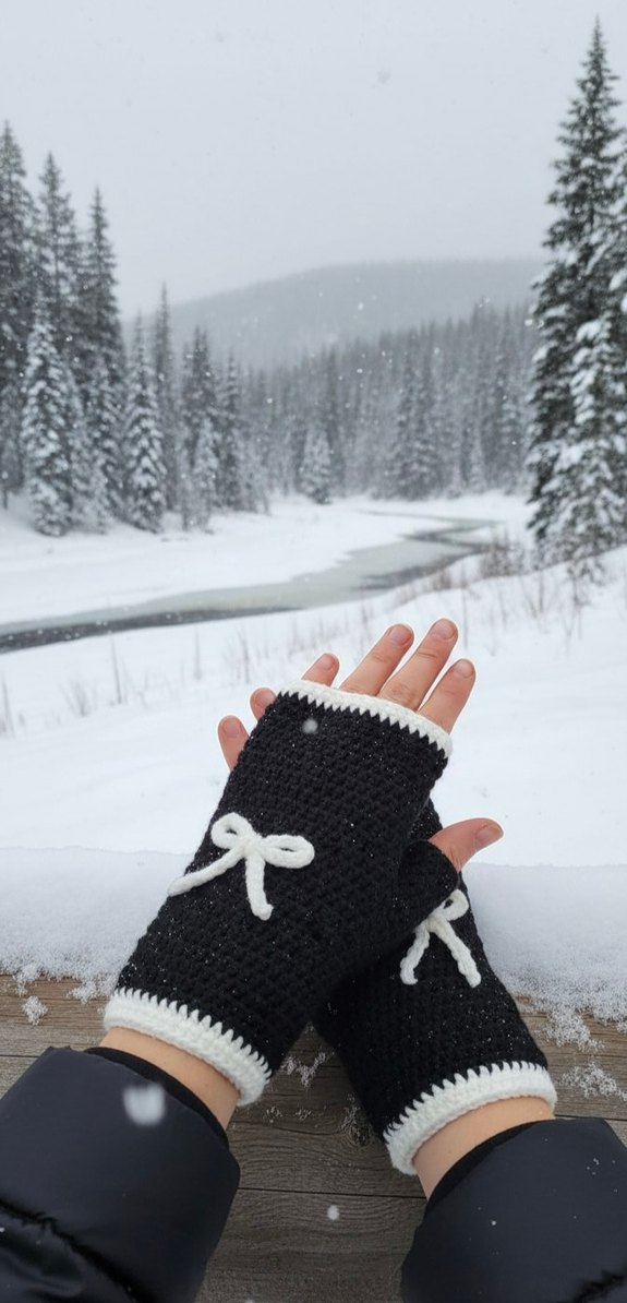 Siyah beyaz örgü parmaksız eldivenler, rahat ve gotik bir tarz sunar. Yumuşak dokusu ve süslü fiyonk detaylarıyla dikkat çeker.