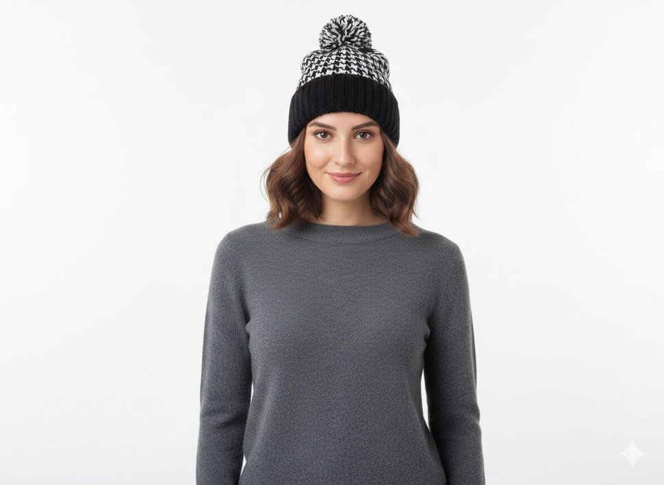 Yumuşak örgüden yapılmış, ponponlu siyah beyaz kadın bere. Günlük, trend bir tarz için uygundur.