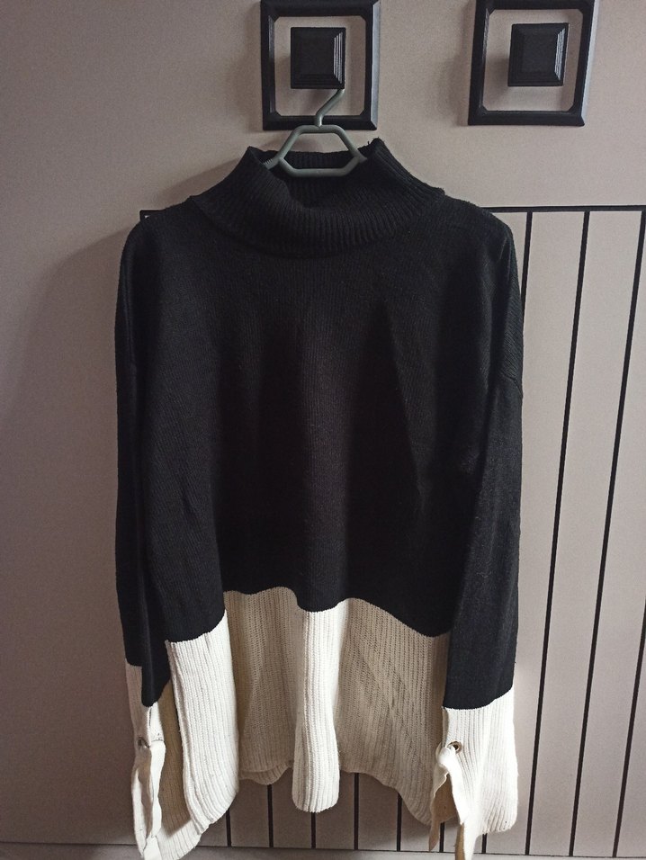 Oversize kesim, boğazlı ve uzun kollu triko kazak. Siyah üst kısmı ve düğme detaylı beyaz ribanalı alt kısımlarıyla rahat sokak stili için uygundur.