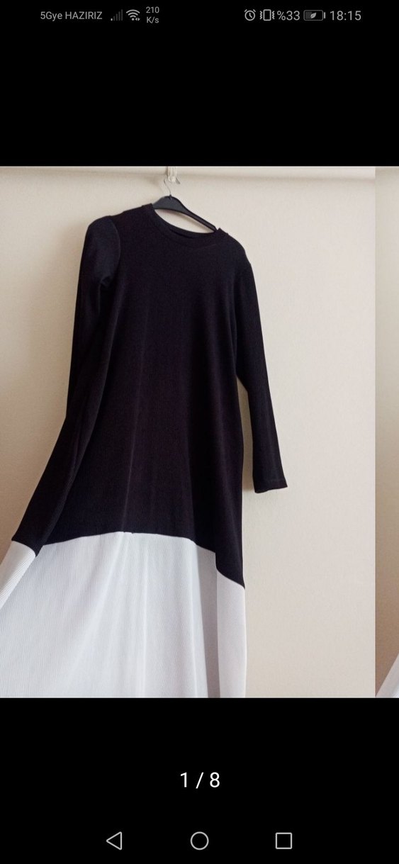 Uzun, bol kesim kadın elbisesi, uzun kollu ve yuvarlak yaka detaylarına sahiptir. Siyah ve beyaz renklerin pilili tasarımla birleştiği minimalist, çağdaş bir modeldir. Sentetik kumaştan üretilmiştir ve günlük kullanıma uygundur.