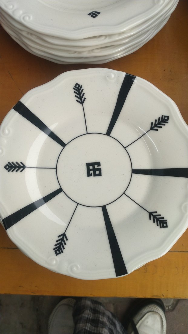 Koyu geometrik ok desenlerine sahip beyaz porselen tabak, sade ve modern bir görünüm sunar. ️