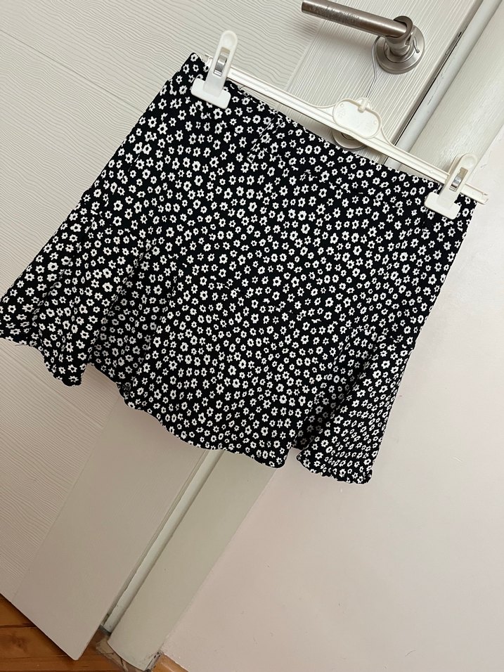 Bu siyah mini etek, beyaz puanlı deseni, fırfır detayları ve pamuklu yumuşak kumaşı ile bol kesimdir. Bohem ve retro sokak stili yansıtır.