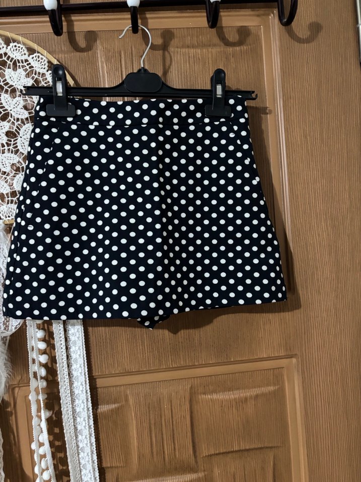 Pamuk kumaştan yapılmış, siyah beyaz puantiyeli bu mini şort etek, günlük kullanıma uygun, retro Paris tarzı sokak modası esintili.