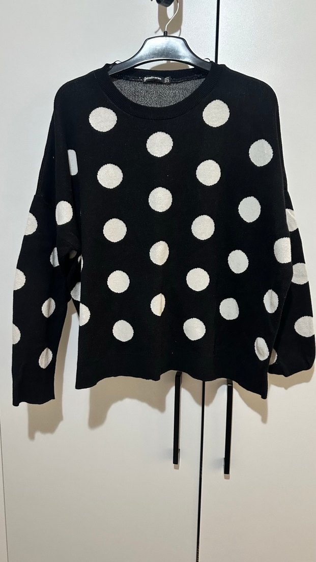 Siyah zemin üzerinde beyaz puantiyelerle süslenmiş, uzun kollu ve salaş kesime sahip triko kazak. Rahat ve sıcak dokusu günlük sokak stili için uygundur.