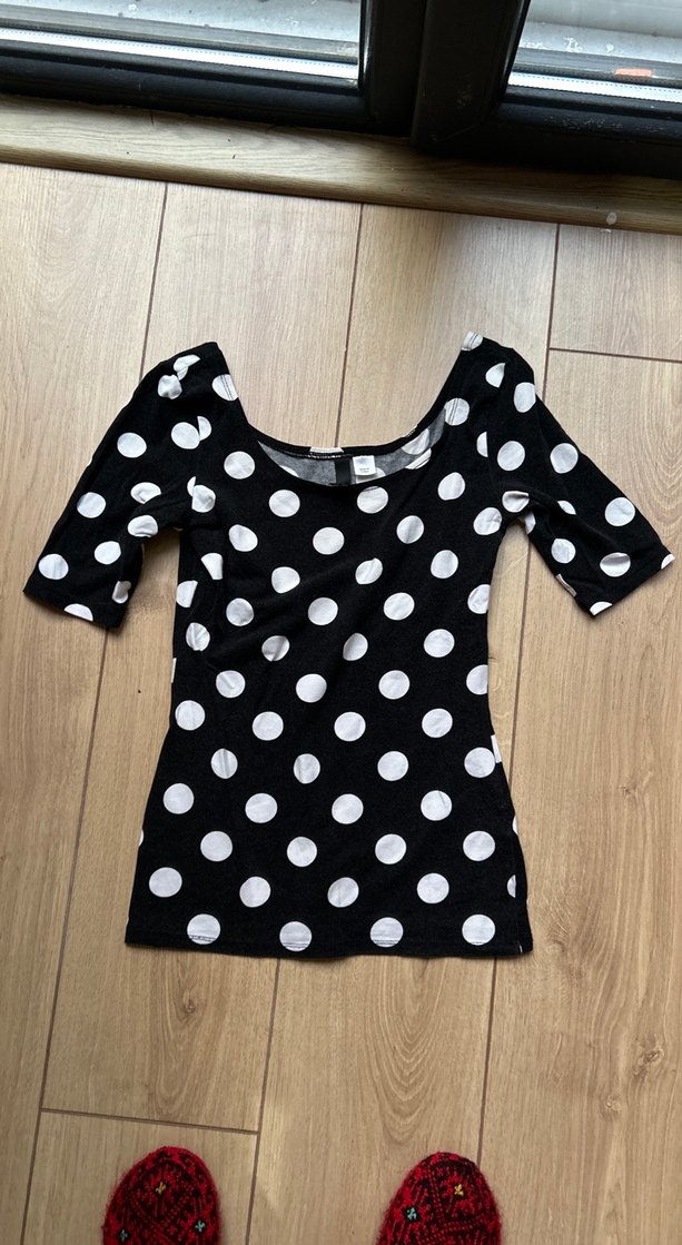 Kısa kollu, siyah beyaz puantiyeli tişört. Pamuklu kumaştan, normal boyda ve bohem-retro tarzında, günlük kullanıma uygun.