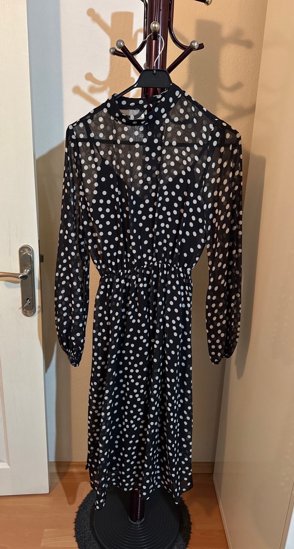 Siyah beyaz puantiyeli uzun elbise, yüksek yakalı ve düğmeli uzun kollu, bol kesim ve belden büzgülü, yumuşak sentetik kumaştan günlük kullanıma uygun.