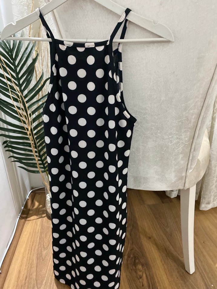 Fitted kesim, askılı ve düğmeli bu elbise yüksek yakaya sahip. Siyah zemin üzerine beyaz puantiyelerle bohem ve retro tarzı yansıtıyor. Günlük kullanıma uygun.