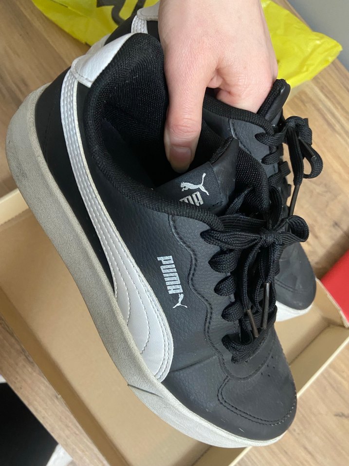Siyah beyaz Puma spor ayakkabılar, kauçuk taban ve cırt cırtlı bantlıdır. Spor sokak stili için topuklu tasarımıyla dikkat çeker. ♀️
