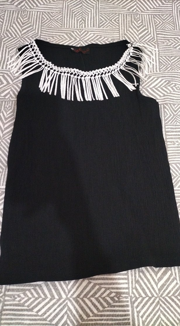 Siyah, beyaz Püskül detaylı, tek parça tunik Kayık yaka ve kolsuz, bohem tarzda, sentetik kumaştan, parti için uygun.Esnek yapısıyla S-M beden için de uygundur.