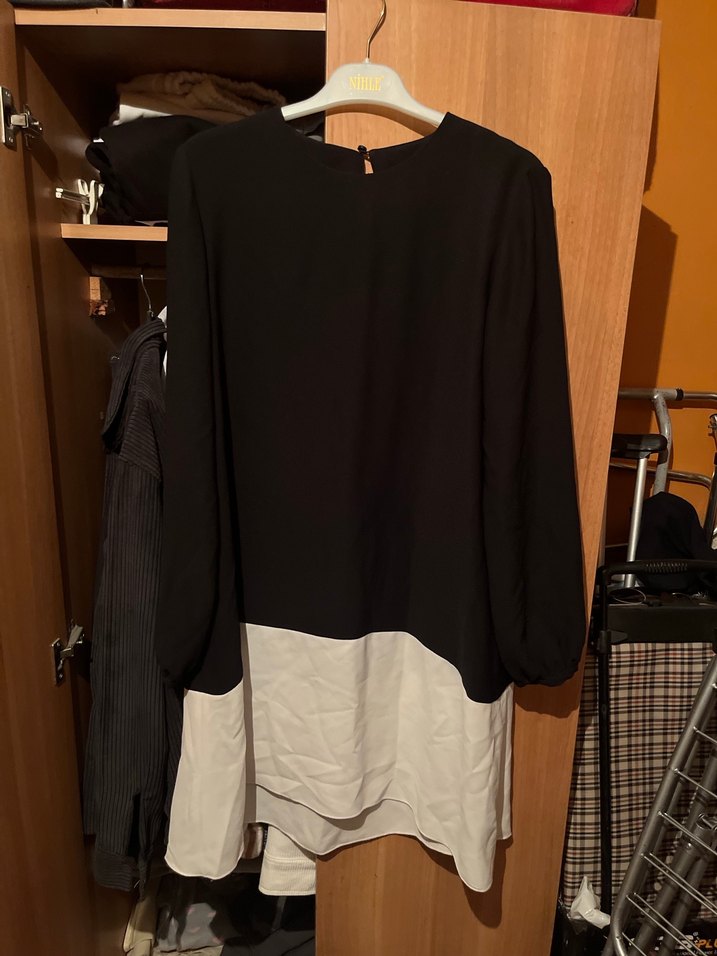 Uzun kollu, yuvarlak yakalı, salaş kesim kadın tunik. İpek gibi dokusu ve siyah-beyaz renk kombiniyle günlük kullanıma uygun.