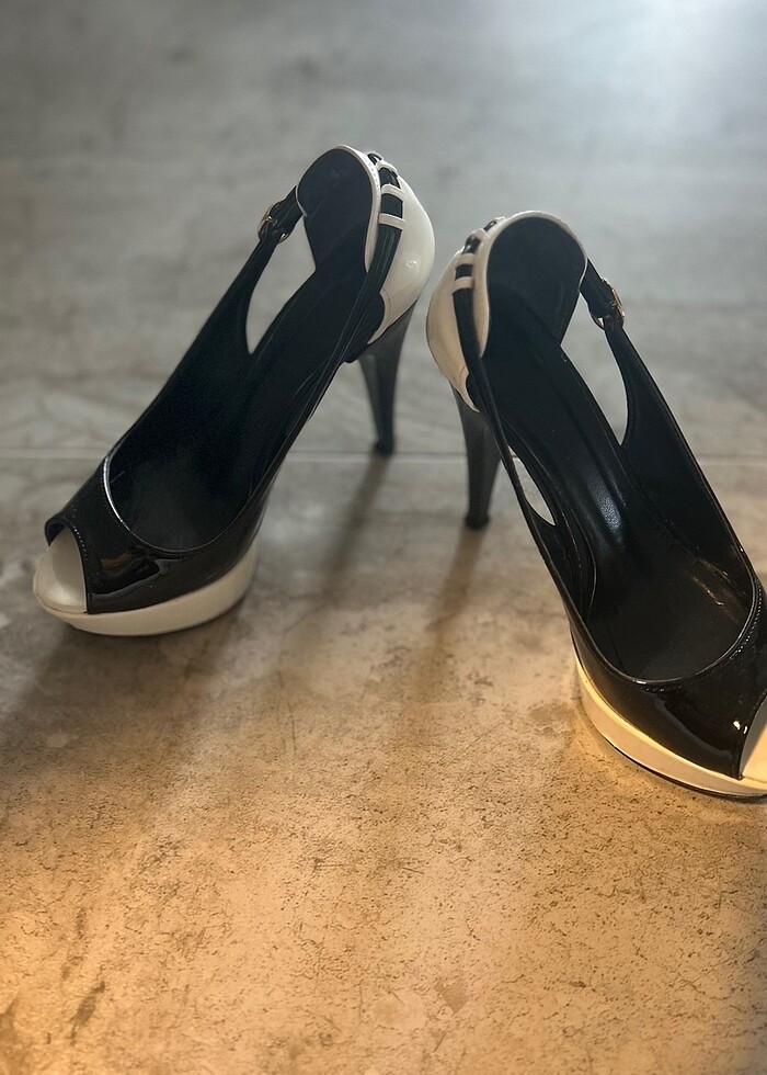 Siyah Beyaz şık dizayn platformlu önü açık gece gündüz giyilebilecek rugan ayakkabı. bir kez giyildi.