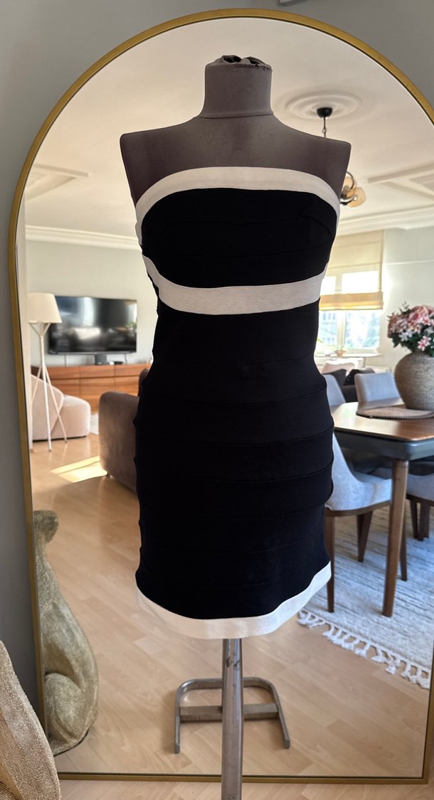 Siyah Beyaz Straplez Midi Elbise