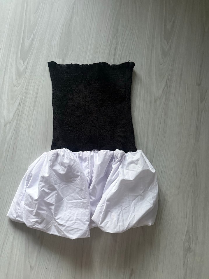 Siyah üst kısmı ve beyaz fırfırlı etek kısmıyla straplez, vücuda oturan mini elbisedir. Kolsuz ve kısa boyludur, sokak modasına uygundur. Altı balon etektir çok kaliteli bir üründür hiç giyilmedi m-l bedenine eşittir