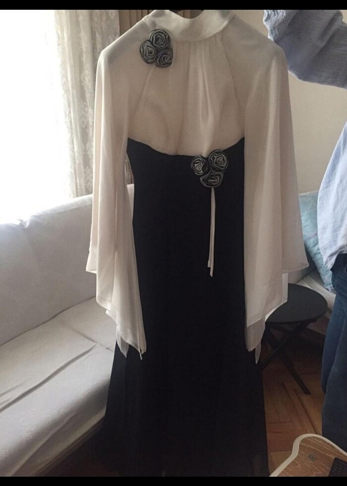 Ürün 2 kez giyildi, çok iyi durumda kaliteli bir abiye. Kollarının içinde beyaz body var. İçi astarlı, tesettüre uygun.