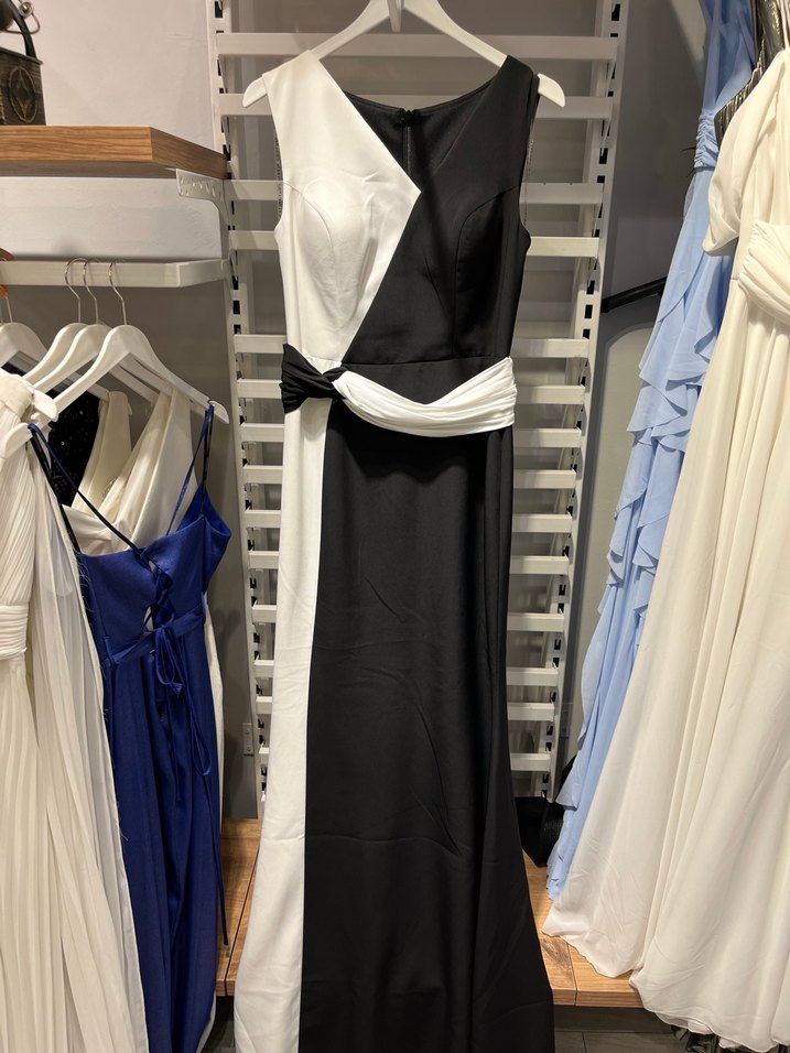 Bu uzun siyah beyaz elbise, drapeli tasarımı, kayık yaka ve ince askılarıyla çağdaş ve avangart bir görünüm sunar. Ofis için uygundur ve düz kesimdir.