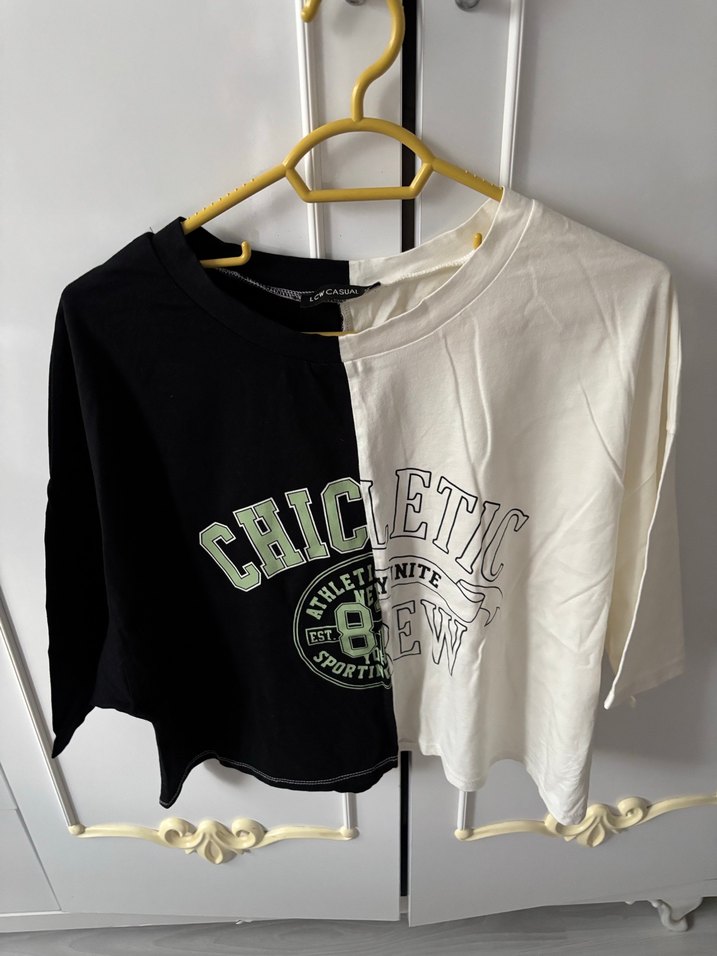 Pamuk kumaştan, siyah beyaz renklerde, baskılı ve uzun kollu bol kesim crop top. Günlük sokak stili için ideal, yuvarlak yakalı.