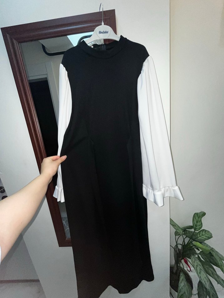 Siyah Beyaz Uzun Kollu Midi Elbise
