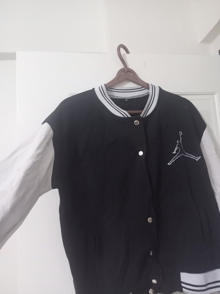 Pamuklu, uzun kollu, düğmeli ve bol kesim siyah beyaz spor ceket. Yuvarlak yakalı, rahat kullanıma uygun.