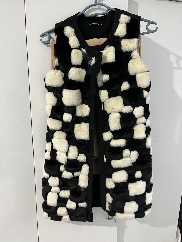Siyah beyaz, yumuşak sentetik kürk detaylı, uzun yelek. günlük sokak stiline uygun.