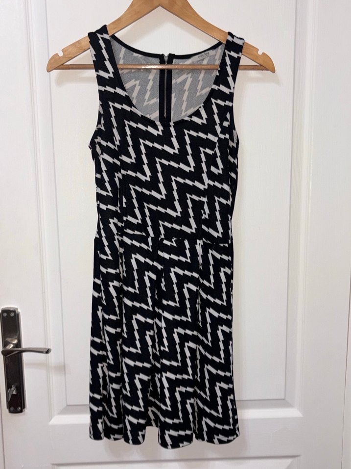 Kalın askılı, V yakalı ve beli oturan bu midi elbise, siyah beyaz desene sahiptir. Arkada fermuarı bulunur ve çok rahattır, günlük ya da özel günlerde giyilir. Her yer için uygundur.