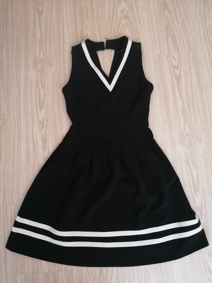 Siyah, beyaz kenarlı V yakalı ve pile detaylı, ince askılı, gövdeyi saran midi elbise. Günlük kullanıma uygun gotik tarzda rahat bir model.