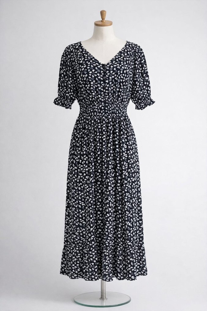 Siyah beyaz uzun elbise, V yaka, kısa kollu ve pileli detaylara sahip. Gevşek kesimi ve minimalist bağlama desenlidir, günlük kullanıma uygundur.