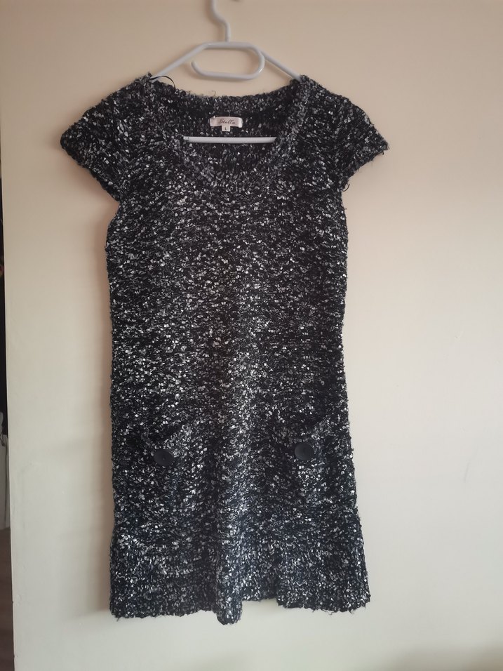 Siyah beyaz ve gri renklerden şantog şık bir kış elbisesi