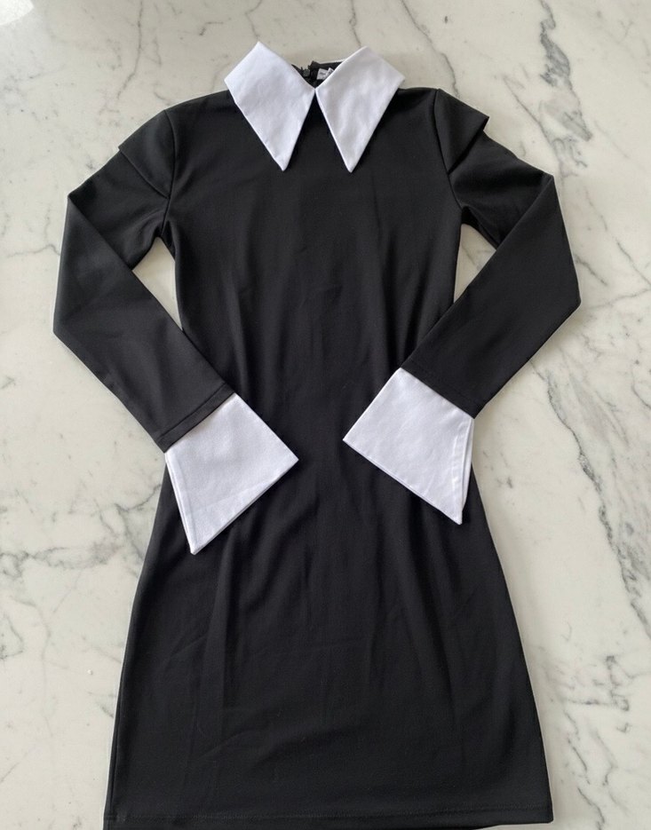 Siyah, uzun kollu, beyaz yaka ve manşet detaylı, sentetik kumaştan yapılmış, vücuda oturan midi uzunlukta gotik elbise. Ofis için uygun şık bir parça.