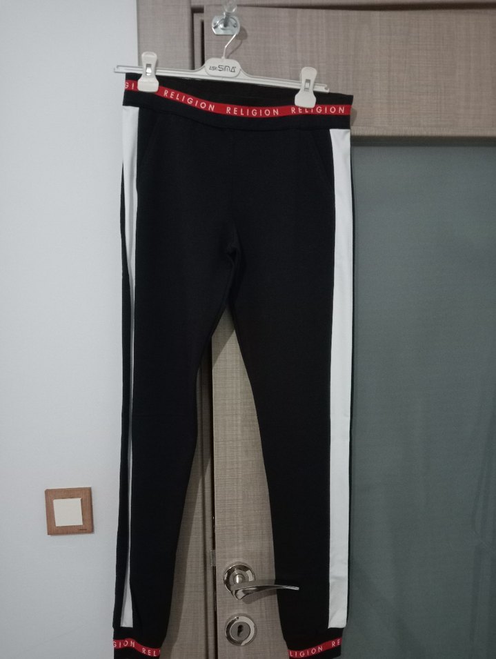 Siyah taban üzerine beyaz yan şeritleri ve 'Religion' yazılı elastik bel bantları bulunan, sentetik kumaştan yapılmış, spor ve günlük kullanıma uygun dar kesim kadın tayt.