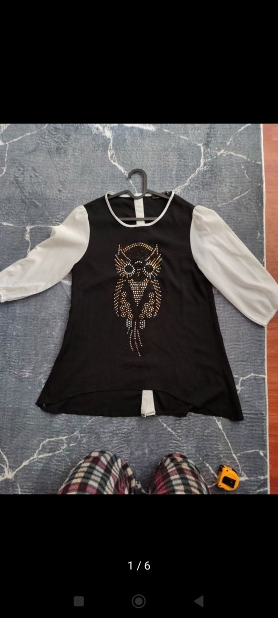 Siyah, yarim kollu, yuvarlak yakalı ve bol kesim kadın bluz, önünde payetli baykuş baskısı bulunur. Gotik tarzda günlük kullanıma uygun.