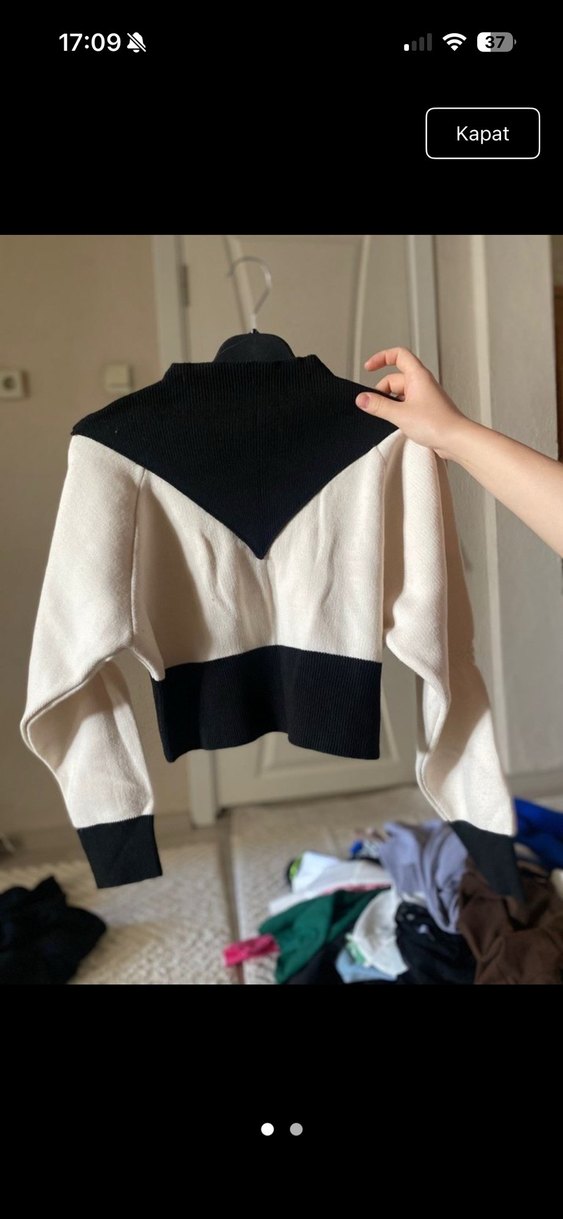 Yüksek yakalı, uzun kollu ve vücuda oturan kadın kazağı, örgü yün malzemeden yapılmıştır. Siyah ve beyaz renk kontrastı ile günlük kullanıma uygun şık bir sokak stili sunar. Marka temsili