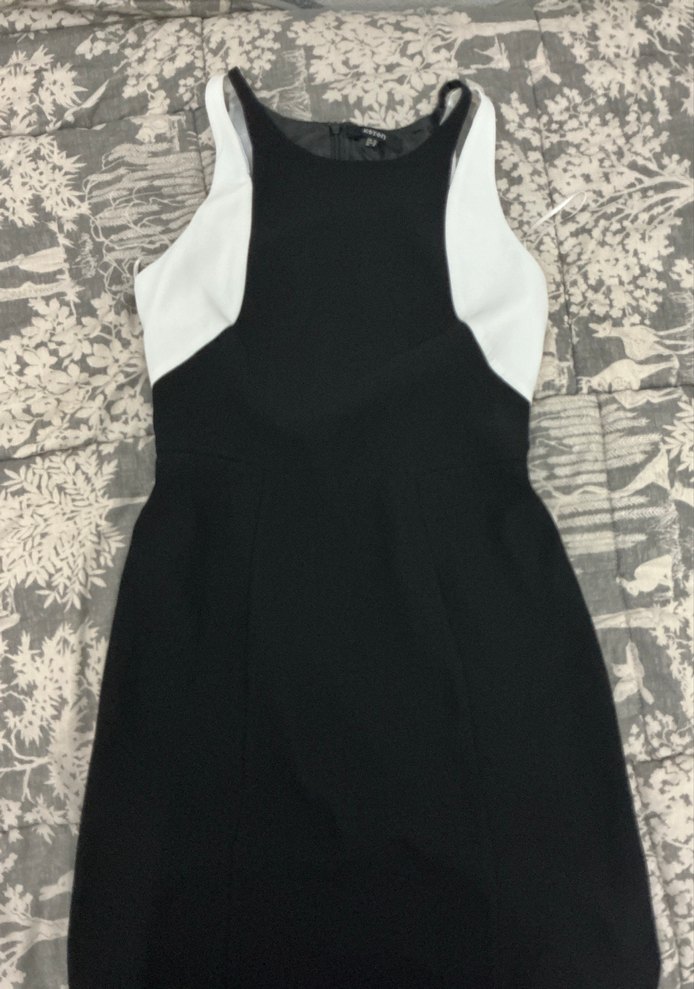 Yüksek yakalı, kolsuz, belden oturan midi elbise, fermuar detayıyla. Siyah ve beyaz renkleriyle modern bir ofis tarzı sunar.