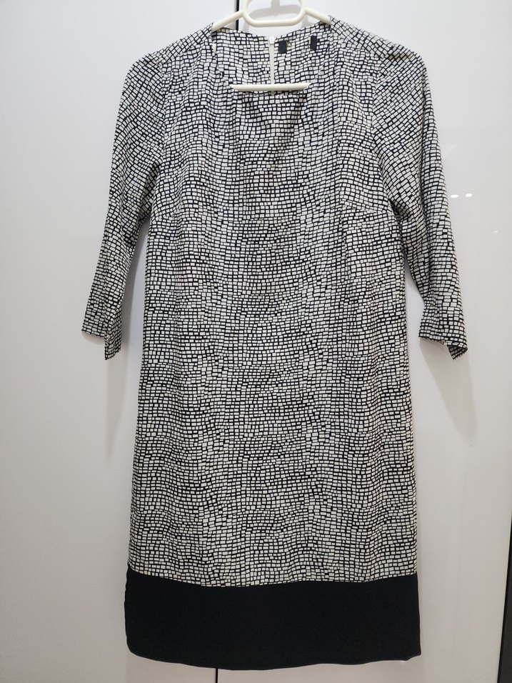 Siyah beyaz, yuvarlak yakalı, midi uzunlukta, 3/4 kollu kadın elbise. Ofis kullanımı için uygun. herhangi bir defosu veya yıpranması yok. az kullanıldı. Ölçüleri fotoğraflarda mevcut.