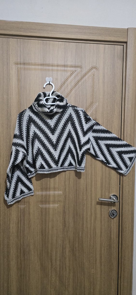 Siyah Beyaz renginde, zebra desenli, balıkçı yaka, uzun kollu, kısa kesim, bol kesim örgü kazak. Trend sokak stili için uygun.