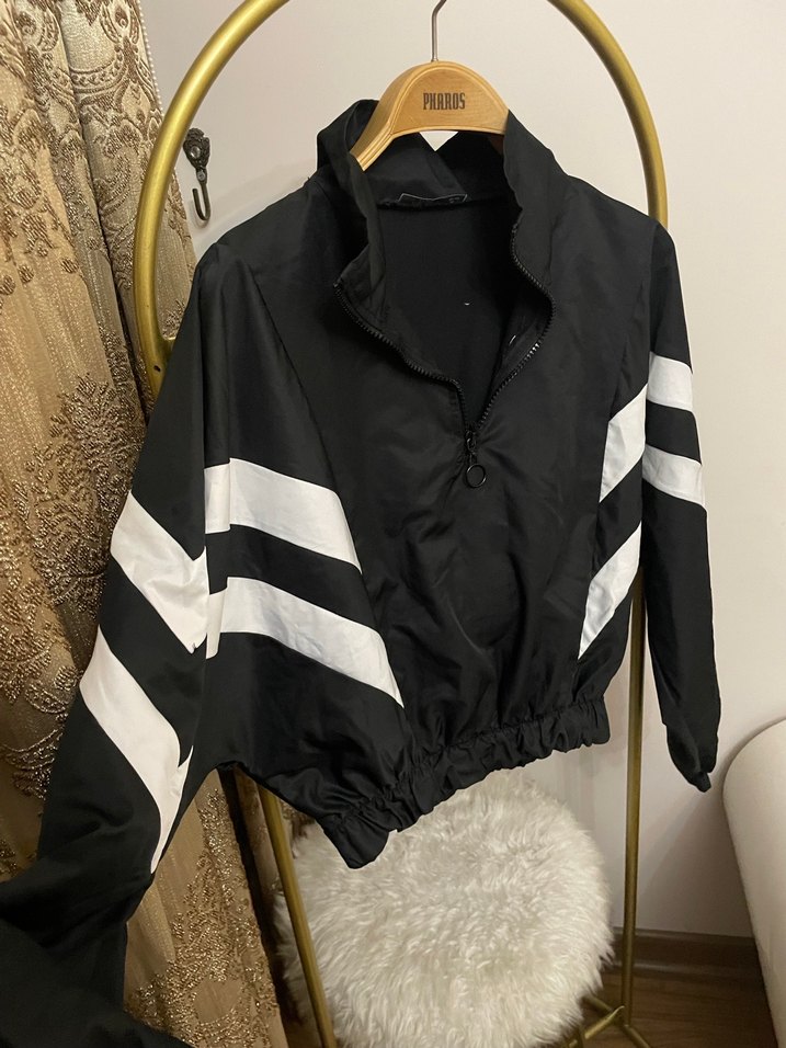 Siyah beyaz zebra desenli, bol kesim, yüksek yakalı ve uzun kollu spor ceket. Sentetik kumaştan, fermuarlı ve günlük kullanıma uygun. Alt üst takım