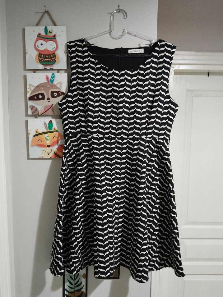 Siyah beyaz zebra desenli, kolsuz, V yakalı, pileli hamile elbisesi. Midi boy, sentetik kumaş, vücuda oturan kesim.