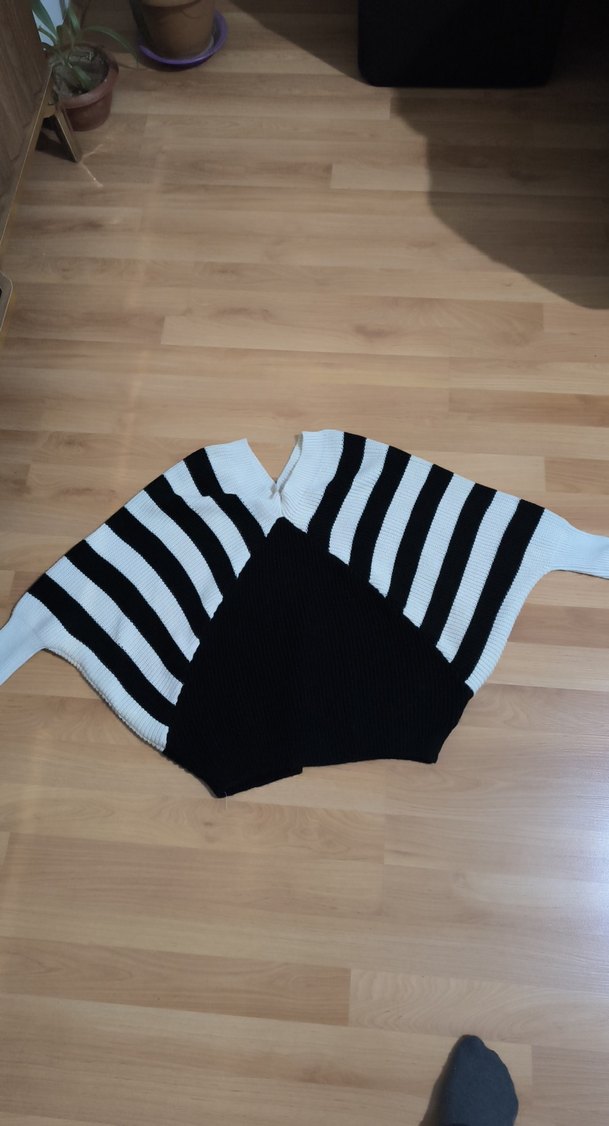 Siyah beyaz zebra desenli, kısa boy, bol kesim kadın triko kazak. Salaş ve günlük sokak stili için uygundur.