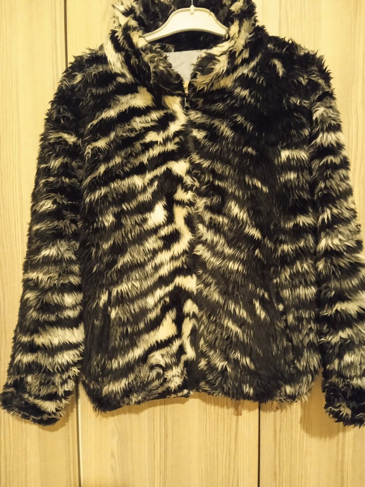 zebra desenli, uzun kollu, yüksek yakalı suni kürk ceket. Salaş kesim ve midi boydadır, günlük kullanım için uygundur. 12 yaş etiket ama s beden birine oluyor