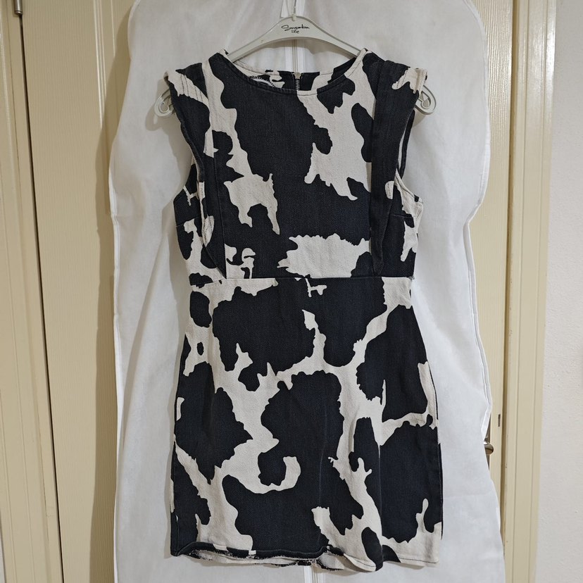 Siyah ve gri zebra desenli, kolsuz düz sentetik kumaştan yapılmış vücuda oturan midi elbise. Günlük kullanıma uygun, çağdaş tarzda.