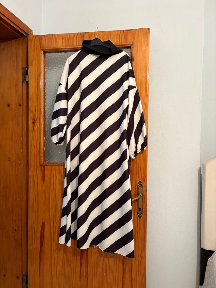 Uzun boy, bol kesim, drapeli ve yüksek yakalı elbise. Siyah beyaz zebra desenli, uzun kollu ve sentetik kumaştan yapılmıştır. Bohem stil için uygun. Melike tatardan aldım